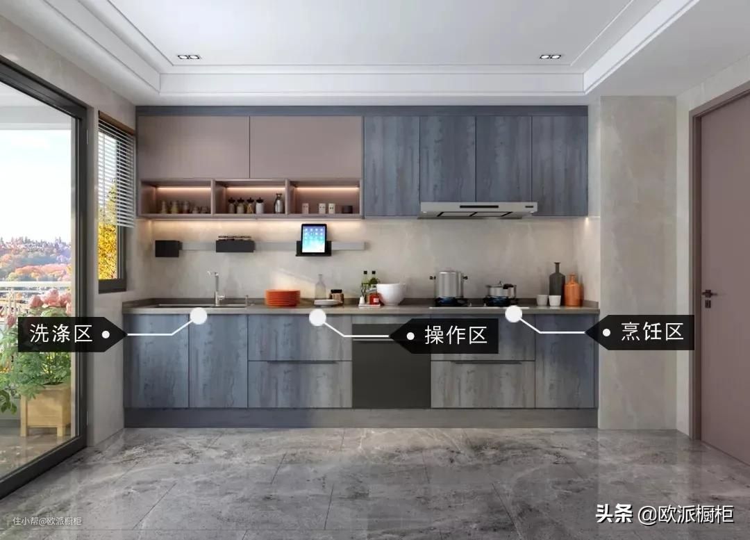 在一字型厨房布局,洗涤、操作、烹饪应在同一平面上,动线顺畅自然,才能让整个烹饪过程省时省力,妥妥提升下厨舒适度!