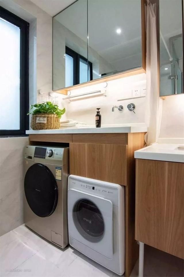 而卫生间以多功能化的性质为主,洗衣机和烘干机,都被嵌入到台盆下方的柜子之中,同时考虑到孩子使用的便利性,还加入了一高一低的双台盆设计,使用起来更为便利。
