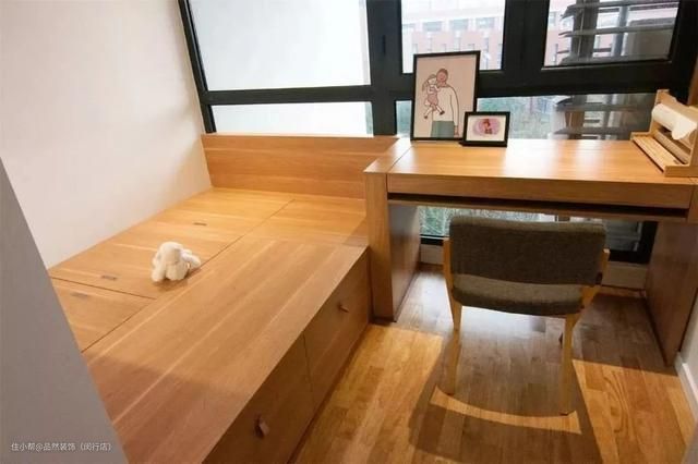 而通过父母房,可以进入儿童房空间,以榻榻米+书桌的组合式空间,就是这个家里硬生生挤出来的“第三个房间”,作为家里宝贝的小房间,温馨且自在,而且采光一流,学习还是玩耍都特别方便。