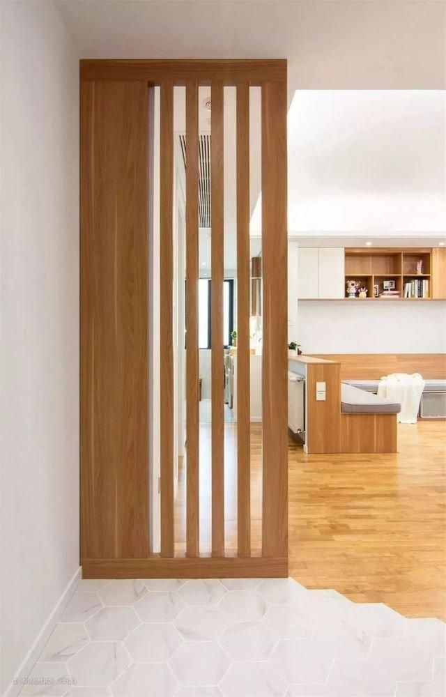 入户后的第一眼,就是客厅。考虑到入户隐私问题,设计师在入户的正对面处,加入了一道原木的格栅隔断,既不影响采光,也起到了遮挡的作用,同时玄关处加入了时下流行的六边砖,与客餐厅的原木地板,形成了“泾渭分明”的层次感,自然又大方。