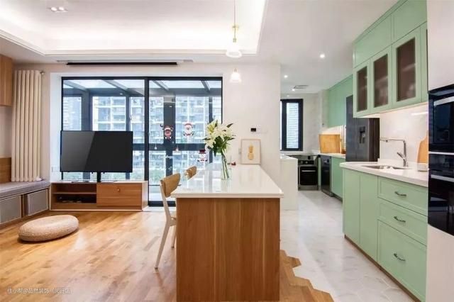 为了实现二房改造三房的空间,设计师以开放式的布局,将餐厨与客厅放在一个空间之中。厨房一旁是岛台式餐桌,餐桌一旁则是客厅空间,原木风与浅绿之调,成为了不同功能区之家的划分。