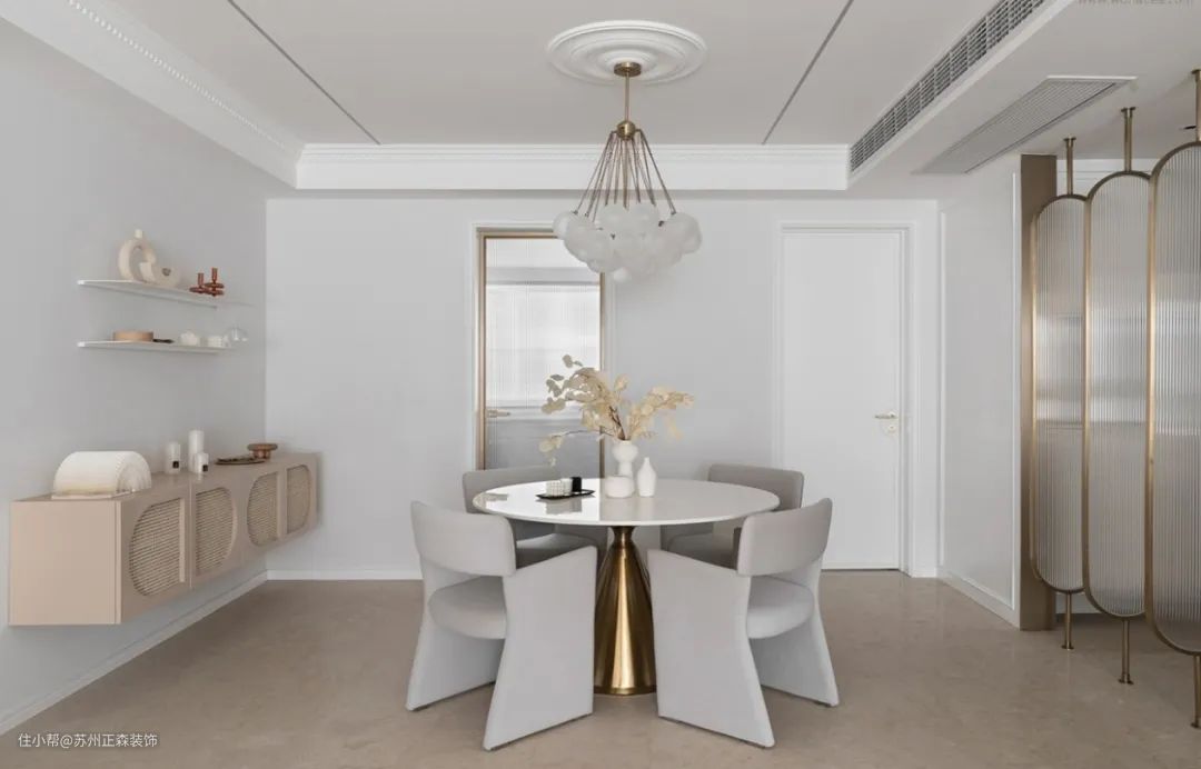 ▲餐厅与客厅保持一种的淡雅色调,左侧装上一个悬空的木色餐边柜,布置精致优雅的装饰画,带来一种精致优雅的氛围感;中间布置金属脚架的大理石台面餐桌,结合灰色皮艺餐椅,也让用餐空间显得实用华丽又端庄。