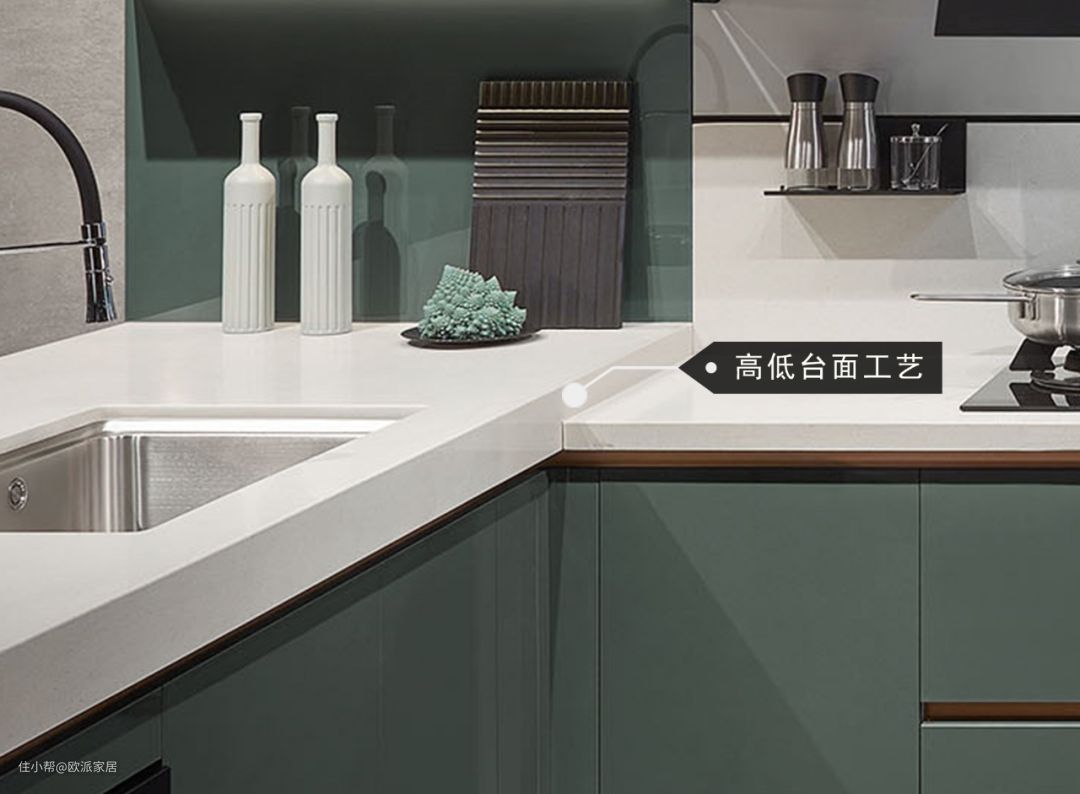 3、橱柜台面前后做挡水条,避免洗菜、洗碗的时候,水流渗透到墙面或流到地面。