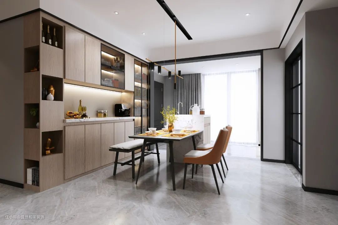 餐边柜主要是用于放置冷热水壶、小电器等,这些物品的尺寸一般不会太大,同时考虑到餐厅本身的空间尺寸相对紧凑,一般餐边柜的深度是在350-400mm左右,如果要嵌入冰箱或烤蒸箱的话,可以根据餐厅整体设计适当做深;此外,为了提升餐边柜的实用方便,一般会在餐边柜做一个高度600mm以上的开放格,方便常用物品的放置收纳。
