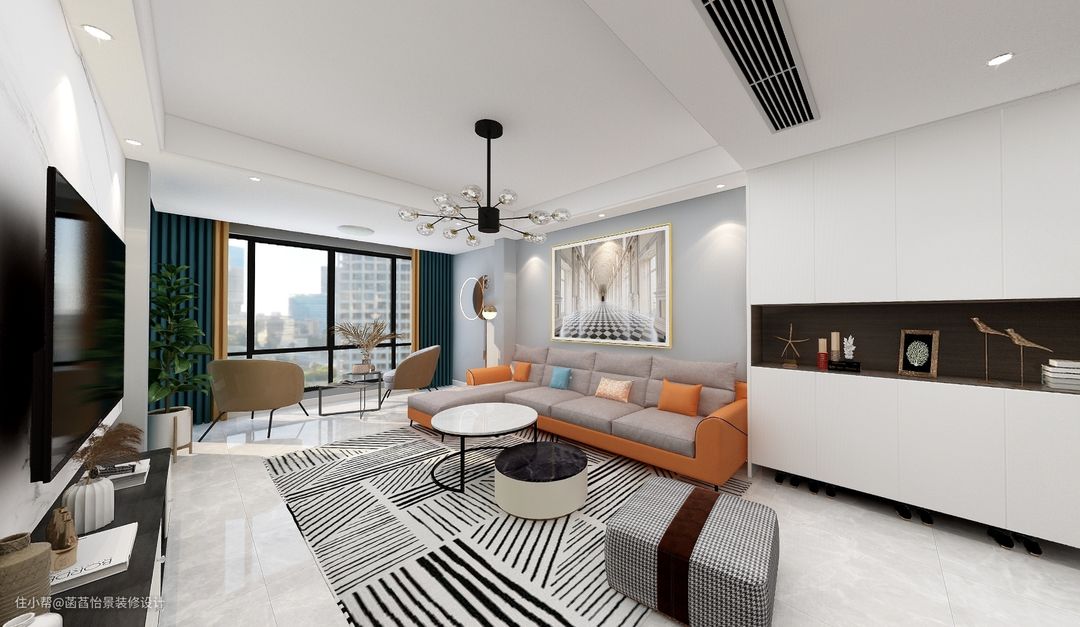 定制的玄关一直延伸到客厅区域,整洁大气,白色的岩板餐桌搭配着三色的餐椅,让这个单调的色彩空间,多了一份亮色。
