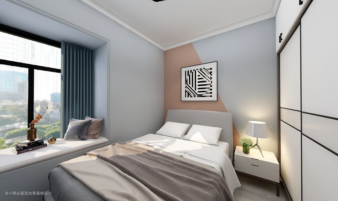 次卧的设计采用的是双色拼接的乳胶漆,在床头的位置还摆上了一个精致的小台灯,给予空间需求与亮度。