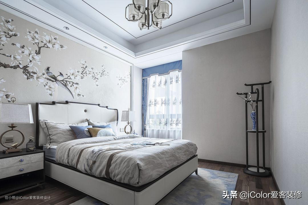 主卧使用典雅的墨蓝色作为点缀,搭配背靠与床品的素雅米白色调,同时在床头墙与背靠之上勾勒几分中式装饰线条设计。