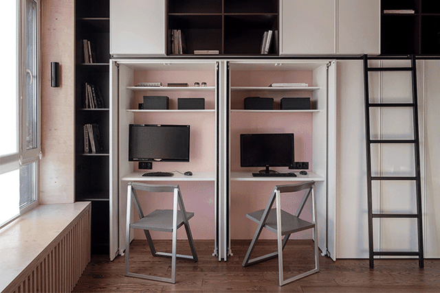 选择并排式的书桌,还可以让孩子相互监督一起学习,若空间足够,则建议增加书柜作为隔墙,明确划分出睡眠与读书区,让孩子可以更专注,提升学习效率。