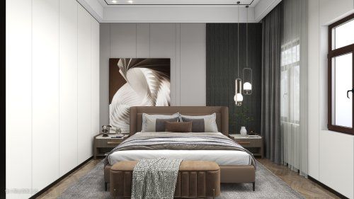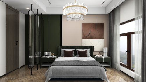 阳光透过纱窗照射进卧室来,产生流动感,彰显写意轻松的高级气质。顶部的奥华蒙德里安大板打破传统,用简洁的现代设计方式塑造富有艺术灵魂的高质感空间,搭配金色/白色镂空的艺术吊灯,更显舒适高级。
