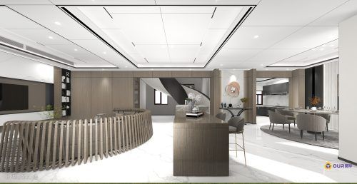 餐厅开放式的设计,有效拓展了公共区域的活动范围与分区层次,超大化挖掘相邻场域的渗透与交互。奥华背景墙画作简约的笔触勾勒艺术感知,纳万象于方寸之中。置身餐厅,坐在柔软宽阔的餐椅上,是一种艺术享受和精神陶冶。