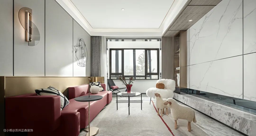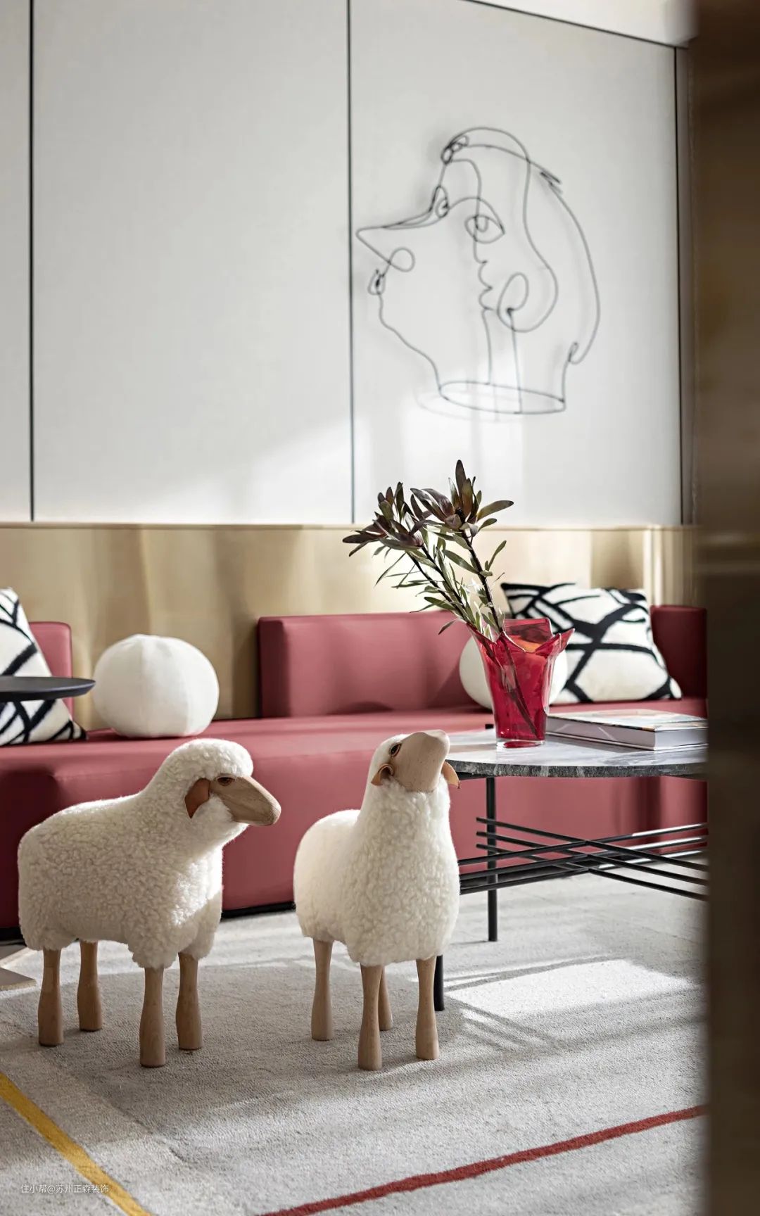 ▲玫红色的皮沙发,结合沙发墙上简约线条的装饰,布置上精致有趣的茶几与小羊造型座椅,带来了一种可爱活泼的时尚与高级气息。