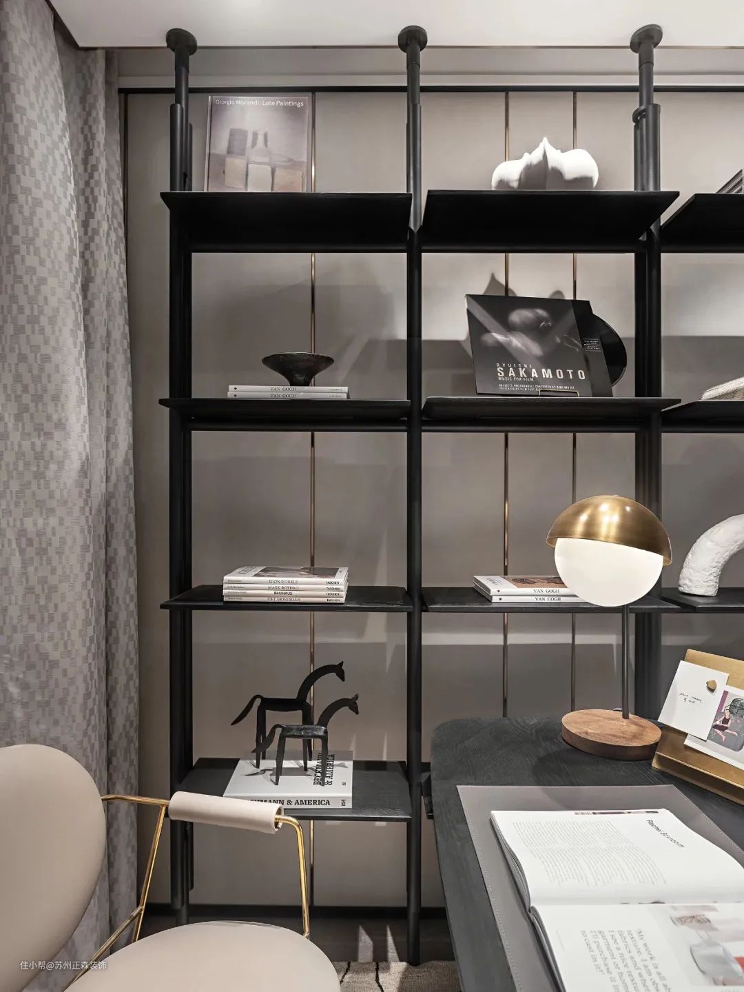 ▲书房布置一张深灰色书桌,侧边定制的黑色书架、以灰色硬包墙面为基础,摆上书籍与摆饰品,也让书房有着更加稳重端庄的文墨气息。