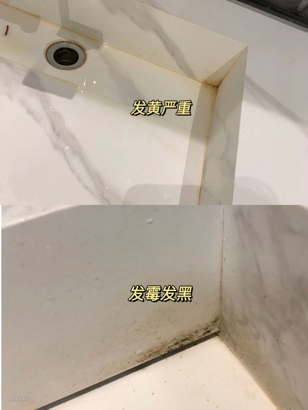 这是住友家用岩板台盆的翻车现场,因为它缝隙都是直角的,积水严重,用不了多久,就会出现发黄、发霉、发黑的问题,擦都擦不掉。