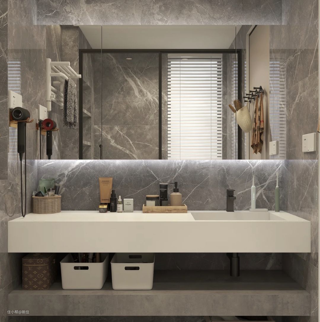 实在喜欢岩板,可以用分体式的—岩板台面+陶瓷盆,但也要注意,中间的陶瓷盆不要太小,否则洗脸时溅水严重,也是鸡肋。