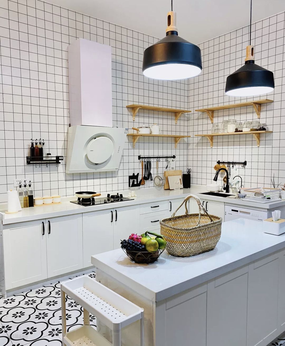 网上的白色厨房不在少数,像这种仅柜体是白色的还不算啥,更夸张的是还要纯白色油烟机、白色台面等等。