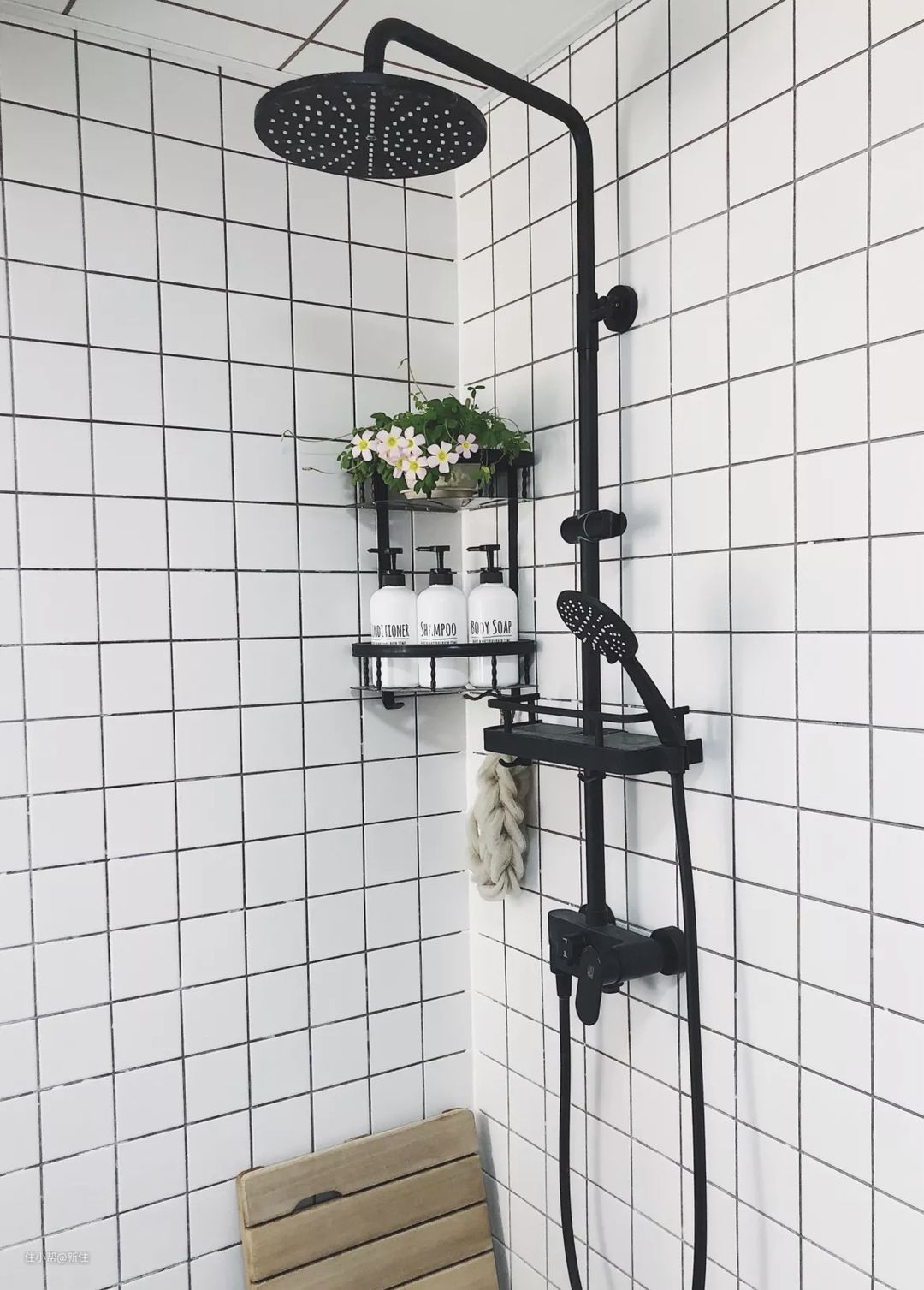 为了宣扬黑色花洒的高端大气,网红博主的图片简直不要太精致,甚至都给淋浴间摆上了花。