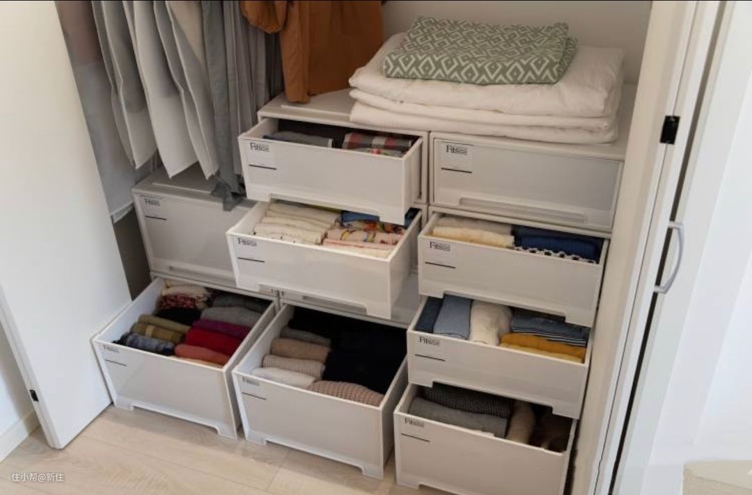 其一是灵活,衣柜里的布局,可以随着抽屉收纳箱的移动而变动,很符合人衣服数量、大小是动态的现实情况,可以这么说,有了抽屉式收纳箱,换季都只是挪挪箱子的事。