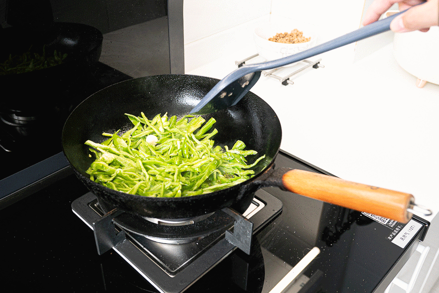再来炒菜试下火力,中式菜品讲究猛火爆炒,先来炒个青椒肉丝,火力够大,吸力也大,辣椒都闻不到辣味。
