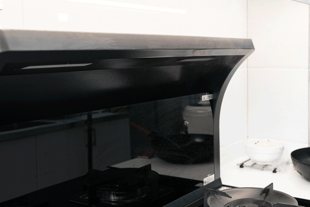 再来看看抽烟烟的效果如何吧,首先使用最容易产生油烟的无涂层铁锅,看到即使这样巨大的油烟,近吸设计的烟机也可以完全吸干净,并且这还是使用的中档风力。油烟不升腾,不会有顶置烟机油烟过脸的问题。