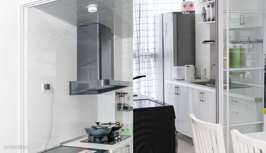 最后来看下安装的效果吧,由于使用了集成灶,顶部可以做满吊柜,收纳空间增加,并且由于改成开放式后,移门拆除,底柜也增加了40cm的,总体收纳增加50%还有多,集成灶采用了全黑的黑武士设计,不想以往很多是不锈钢+黑玻璃总是有点土土的。全黑的集成灶+全白橱柜感觉很配呢。并且宜家的橱柜一定要装侧饰板,以及低沿的装饰条,这样就不再是一个个单独的柜子,而是一个完整的整体。