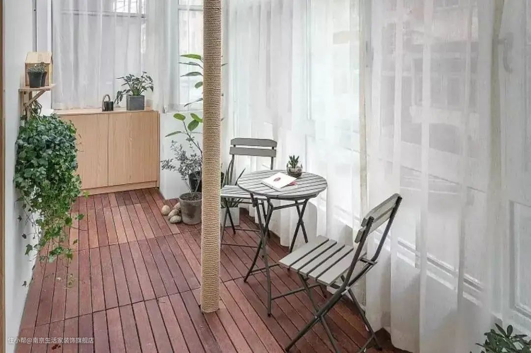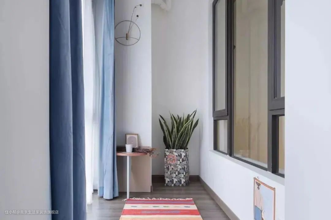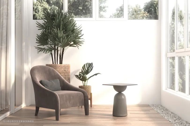 在选择软装时,尽量挑选的与管道相近或相同的颜色,让它们去“迁就”管道,在视觉上减弱管道的存在感。比如阳台使用窗帘、靠枕、坐垫、置物架、花架,墙面颜色,地板颜色等等,都可以进行发挥。