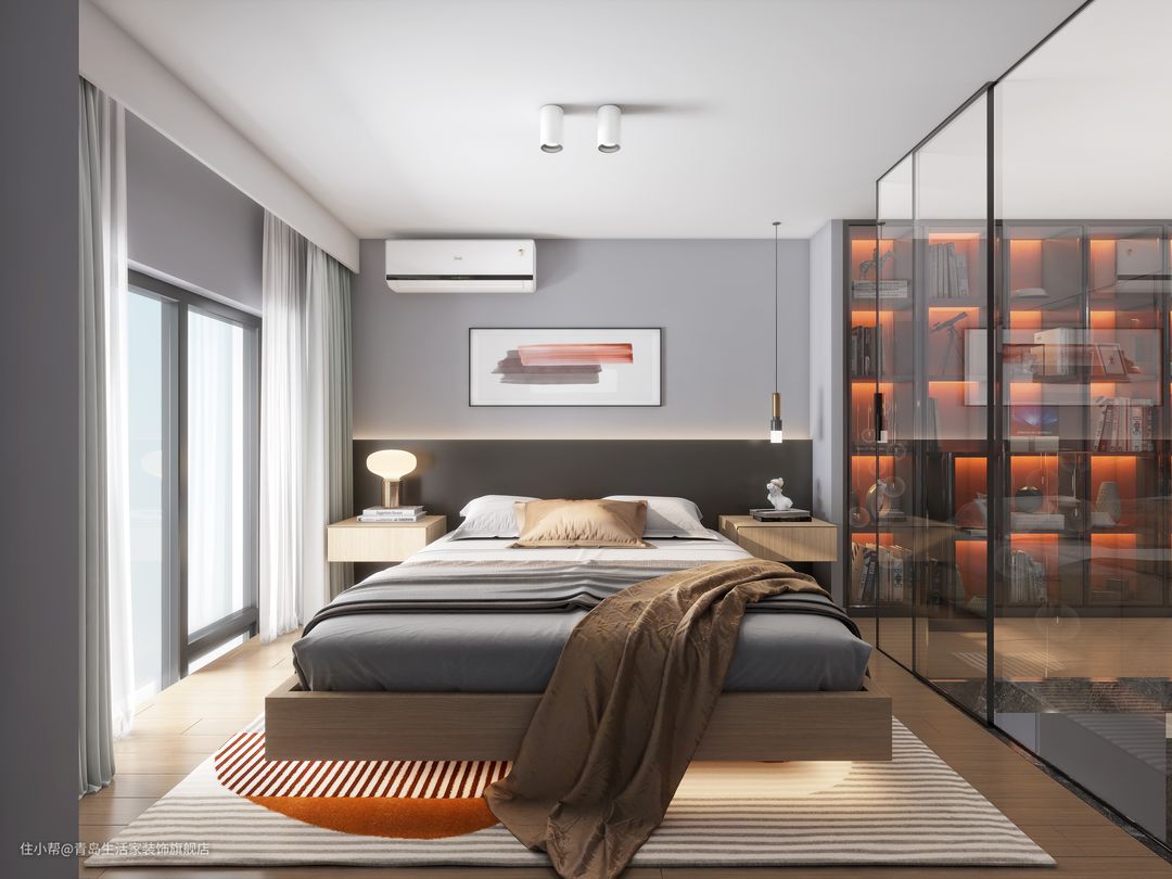 卧室:两间卧室使用玻璃隔门,在业主给予的条件情况下,创造了视觉上通透的感觉。在灰色系中点缀入活跃的黄色。俏皮不失沉稳。