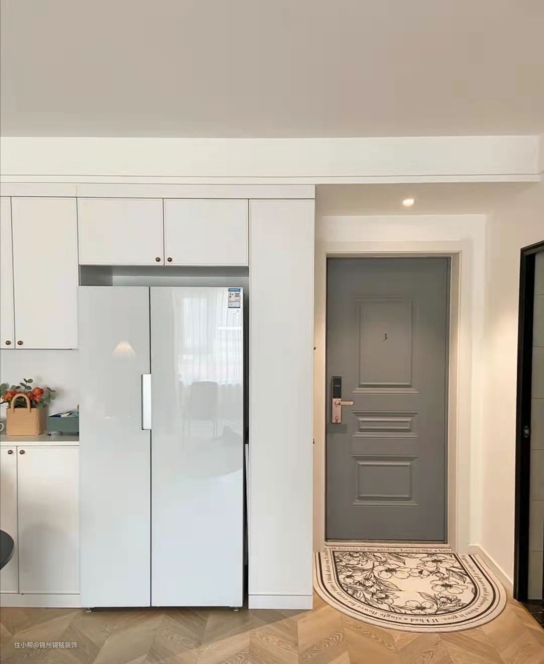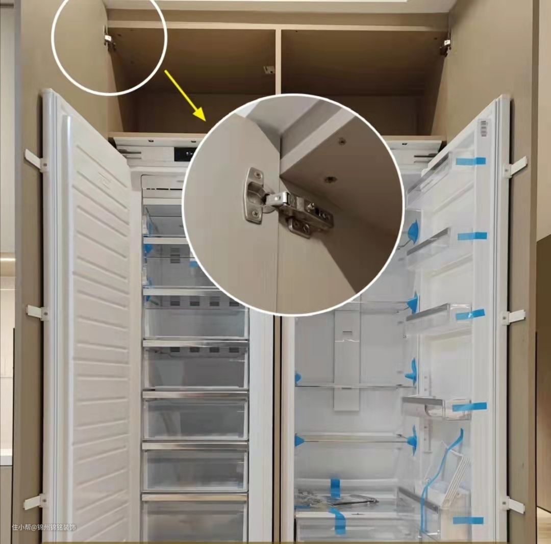 冰箱门板上再安装柜子同款、同色门板。这里最需要注意的是铰链的选择,要用直弯全盖铰链,别用错了关不上门就尴尬了。