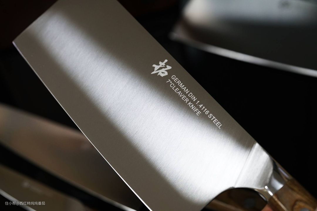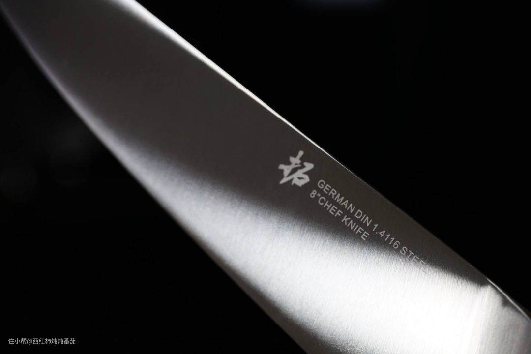 厨刀最关键的钢材部分采用的是德国的 DIN1.4116钢,比大家熟知的国产 5Cr不锈钢要更好,也是德系各“名门”用得最多的钢材。我们可以看到每一把刀的刀身都直接刻上了钢材型号,视觉质感极好 ▲
