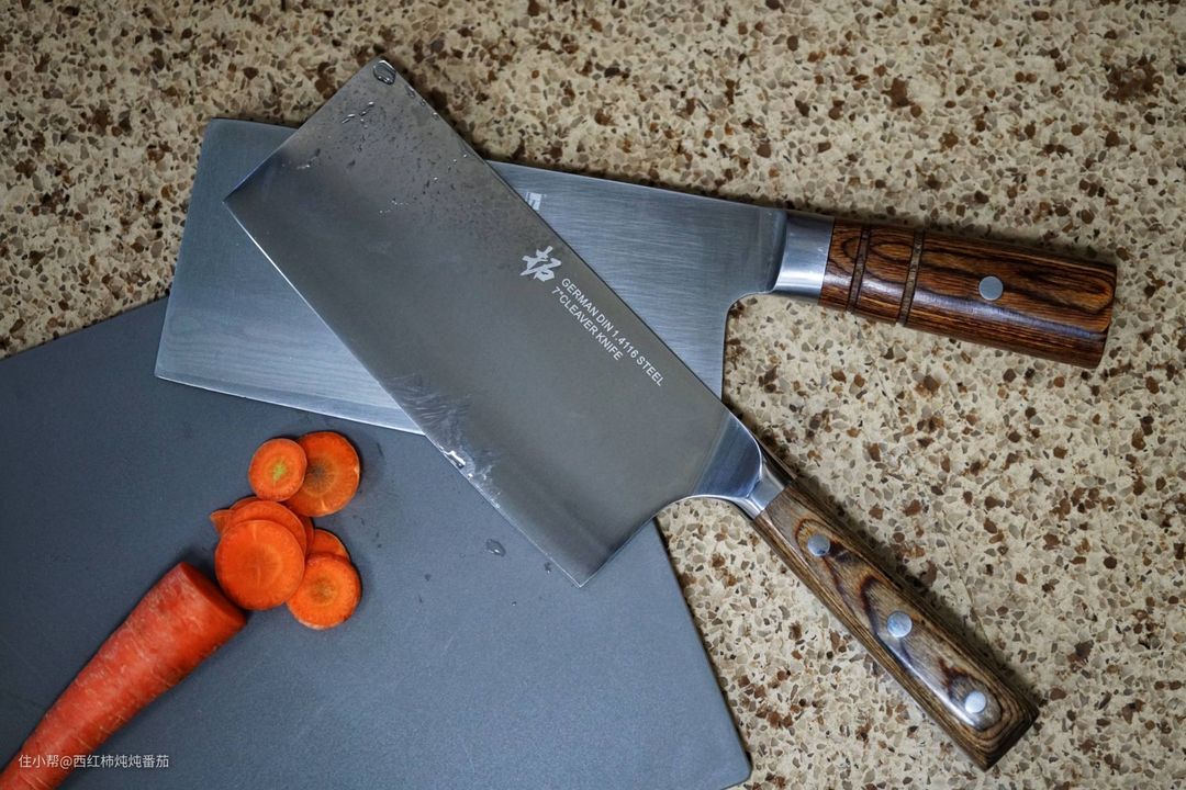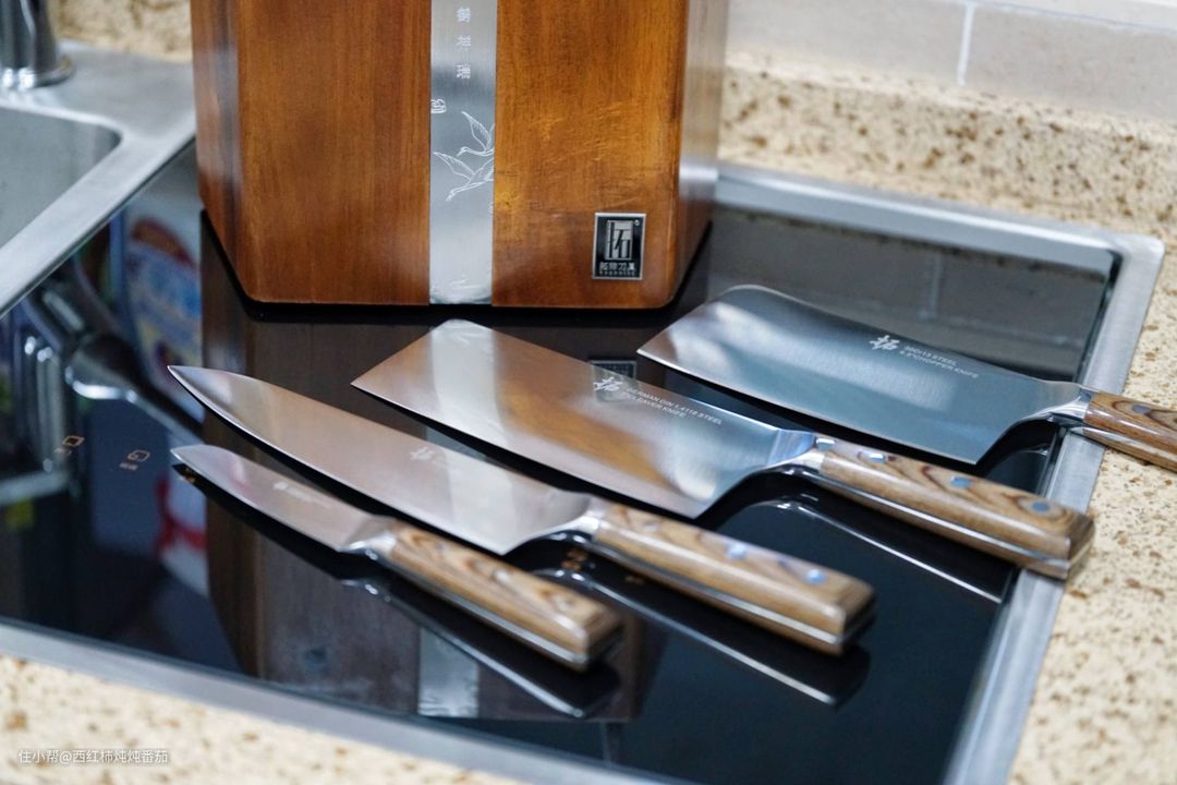 木材的温润可以很好中和刀具的凌厉,使冷峻的厨刀一下子变得古色古香。这也是楼主之所以喜欢拓牌的一个关键细节。