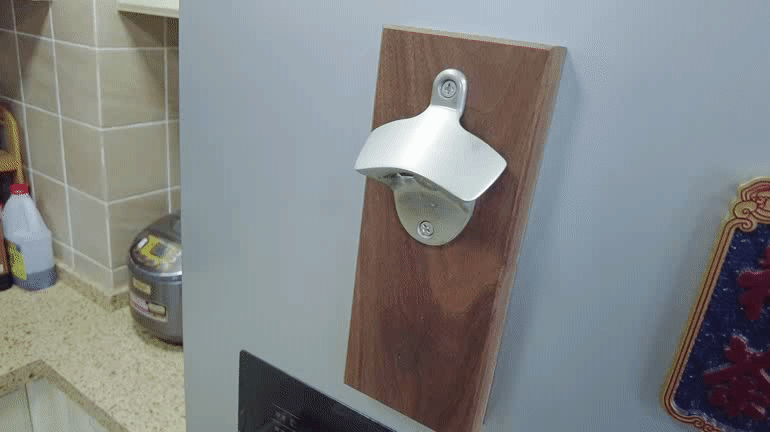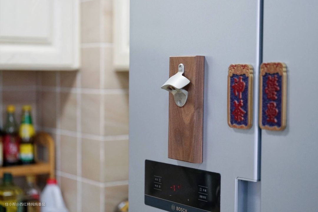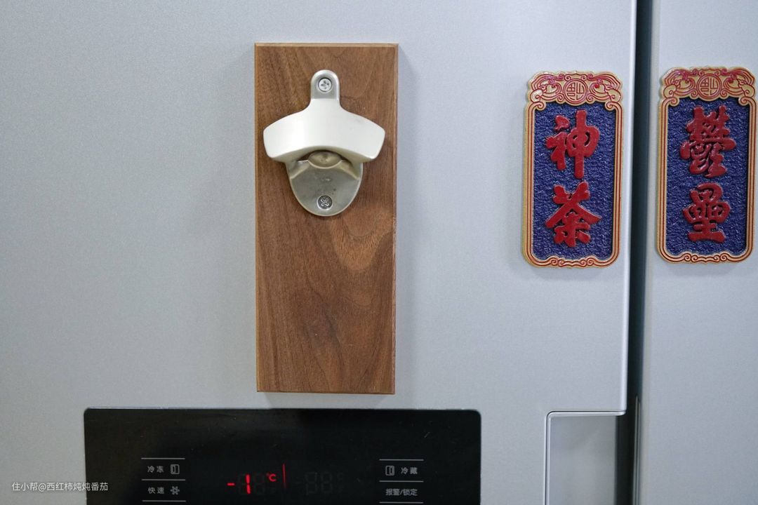 如今东西用了也有一年多了,事实证明买一个吸在冰箱上确实是非常好用!磁吸牢靠,非常稳定,而且掉下来的瓶盖会直接被位于木块内部的磁铁吸住,相当巧妙 ▲