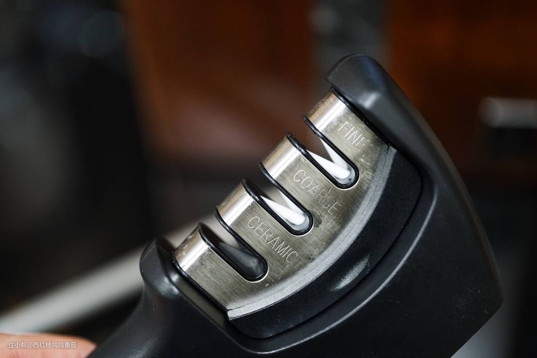 这套刀具配备的是磨刀器。磨刀器共有三档细密度可以选择,分别为 FINE(细磨)、COARSE(粗磨)以及 CERAMIC(陶瓷磨) ▲
