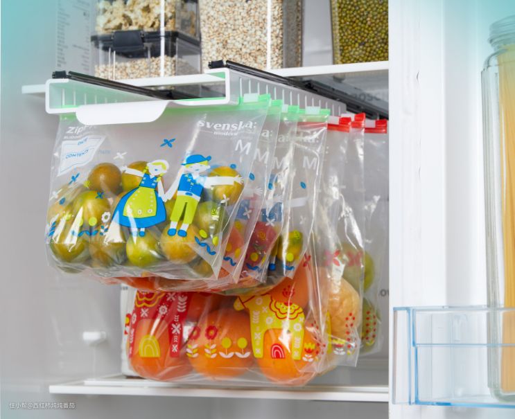 它的正确用法应该是这样的,主要用来挂开篇推荐的自封袋(密实袋),安装位置可以在冰箱里面,也可以在橱柜下方 ▲