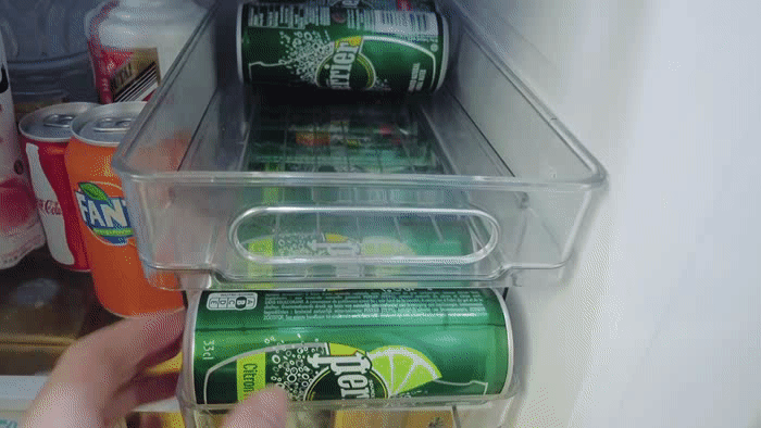 但双层的就不一样了,双层的这款饮料架用来放气泡水还是相当方便的。在下层饮料取出后,上层会自动滚落补上(偶尔会卡一下,可以接受),并且宽度完美契合罐装巴黎气泡水 ▲