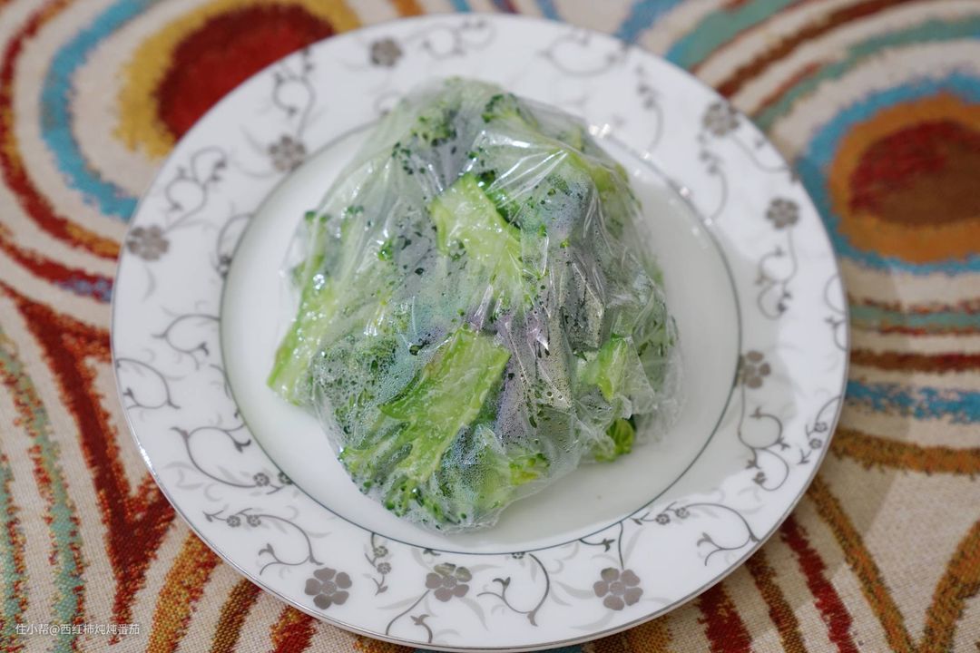 而要做出这道菜的步骤也非常简单:先用保鲜膜将小块的西蓝花裹起来(保鲜膜重叠部分朝下)盘在盘子上,再将盘子放入机器内腔 ▲