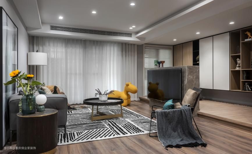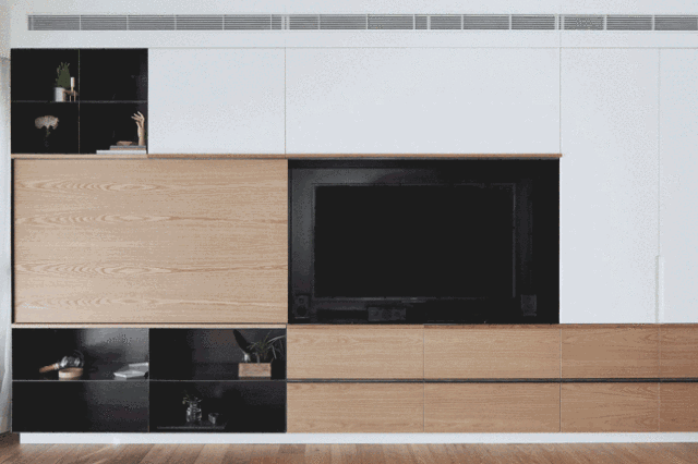 常见的就是书柜式开放展架,中间留出足够空间将电视机镶嵌进去,旁边可以摆放书、装饰品、盆栽等等,这种设计特别适合有大量藏书的书虫和喜欢靠做家务来解压的人。