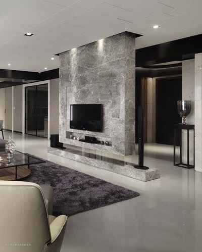 悬空式电视背景墙设计也是近几年备受青睐的一种方式。通常将地台或地柜悬空5-20公分,利用瓷砖、大理石、岩板或者木饰面做装饰,再加上灯带,氛围感妥妥的!