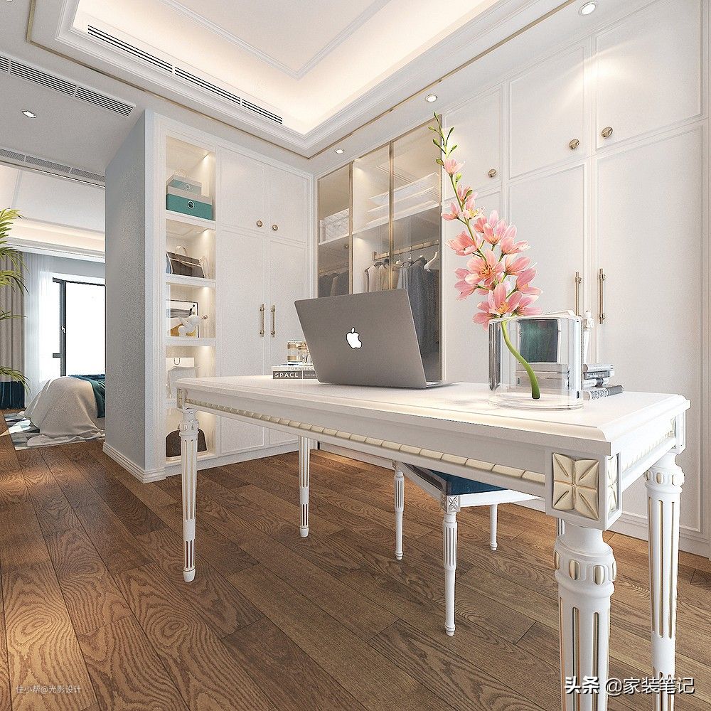 主卧室有独立的衣帽间,落地窗让空间更加敞亮,自然采光效果特别好。衣柜门选择实木和玻璃两种材质,精美又实用。由于衣帽间空间大,中间摆放一张桌子,既可以做书桌又能做梳妆桌。
