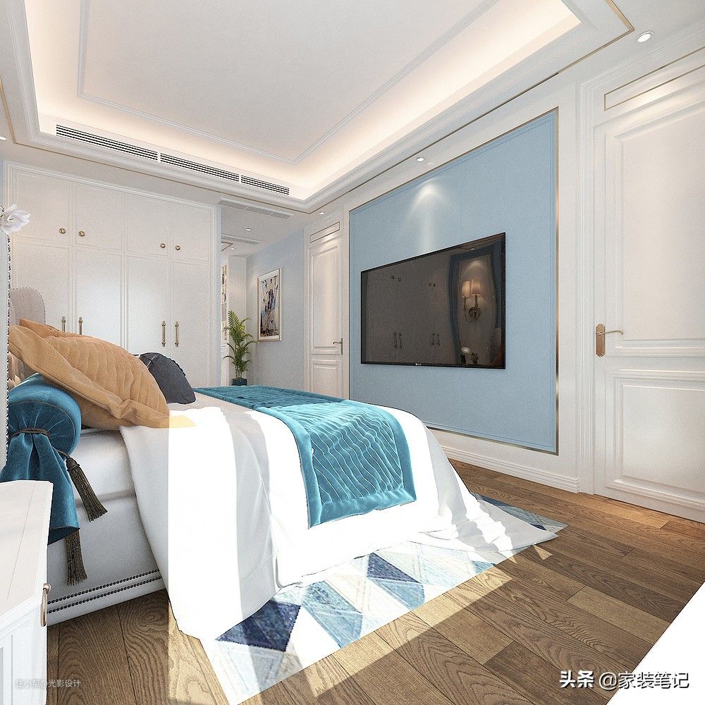 主卧空间不大,但是十分有个性,床尾和床头都做了简单的线条造型,突出层次感,嵌入的金属线条,提高了卧室品质。对于不大的卧室空间,选择无主灯的设计再合适不过了。