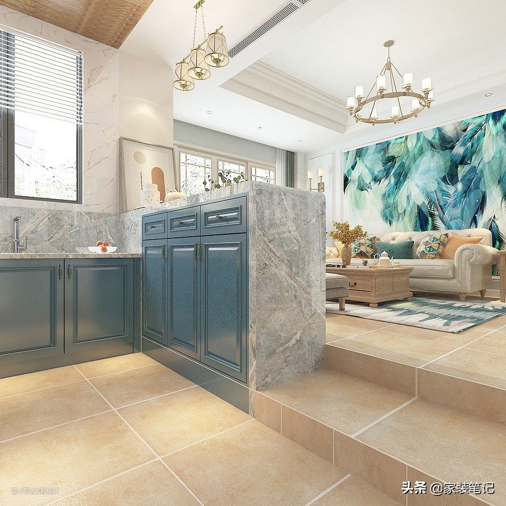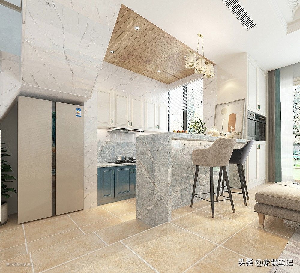 开放式的厨房,让空间足够的宽敞,蓝色的橱柜柜门,更显活力。墙面大理石让空间更加的大气,利用楼梯间下面的空间放双开门冰箱再合适不过了。厨房的顶面没有按照常规做铝扣板,而是选择防腐木吊顶,更有档次。