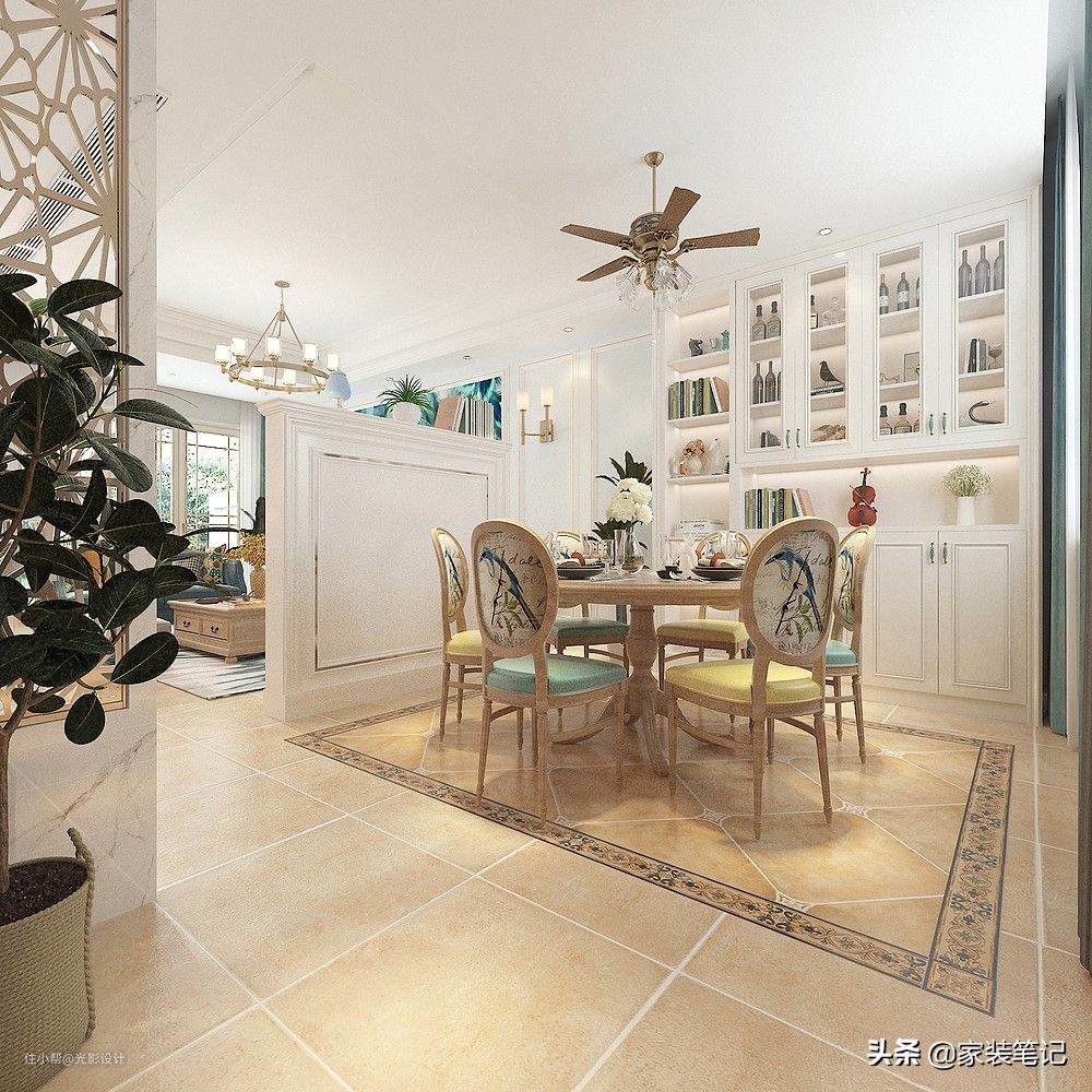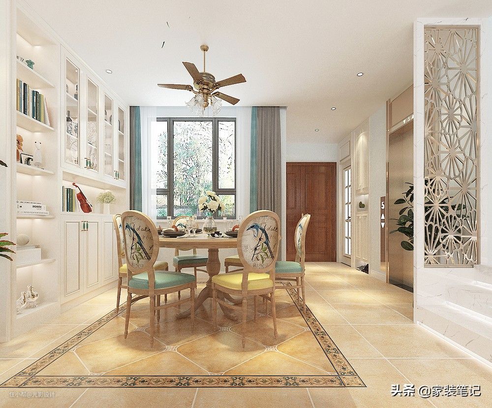 美式风格的餐厅空间,总是弥漫着幸福浪漫的氛围,餐厅和玄关处还有电梯间连接成一片,让空间特别的宽敞,整体很显敞亮。圆形的餐桌,搭配顶面的吊扇灯,很有美式味道。酒柜旁边做了一组展示柜,层板里面暗藏灯带,显得格外精致。
