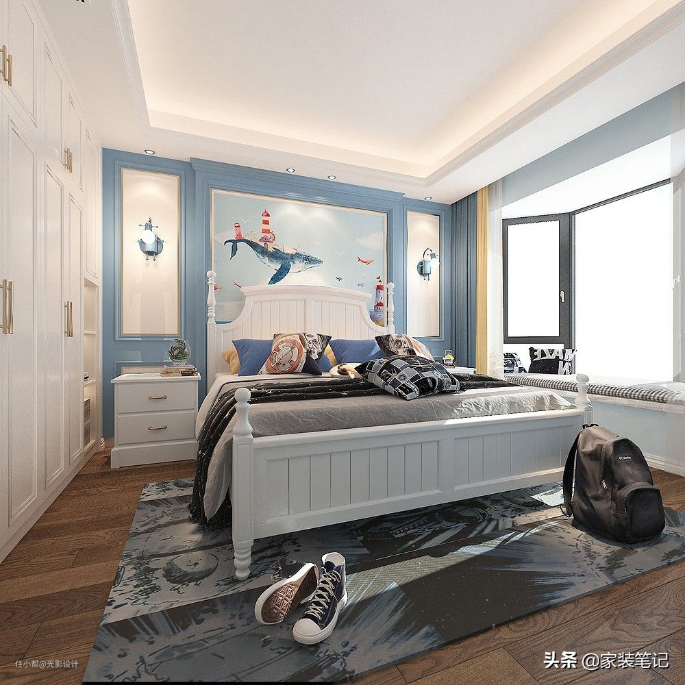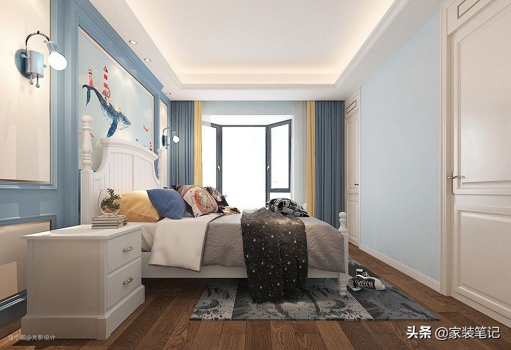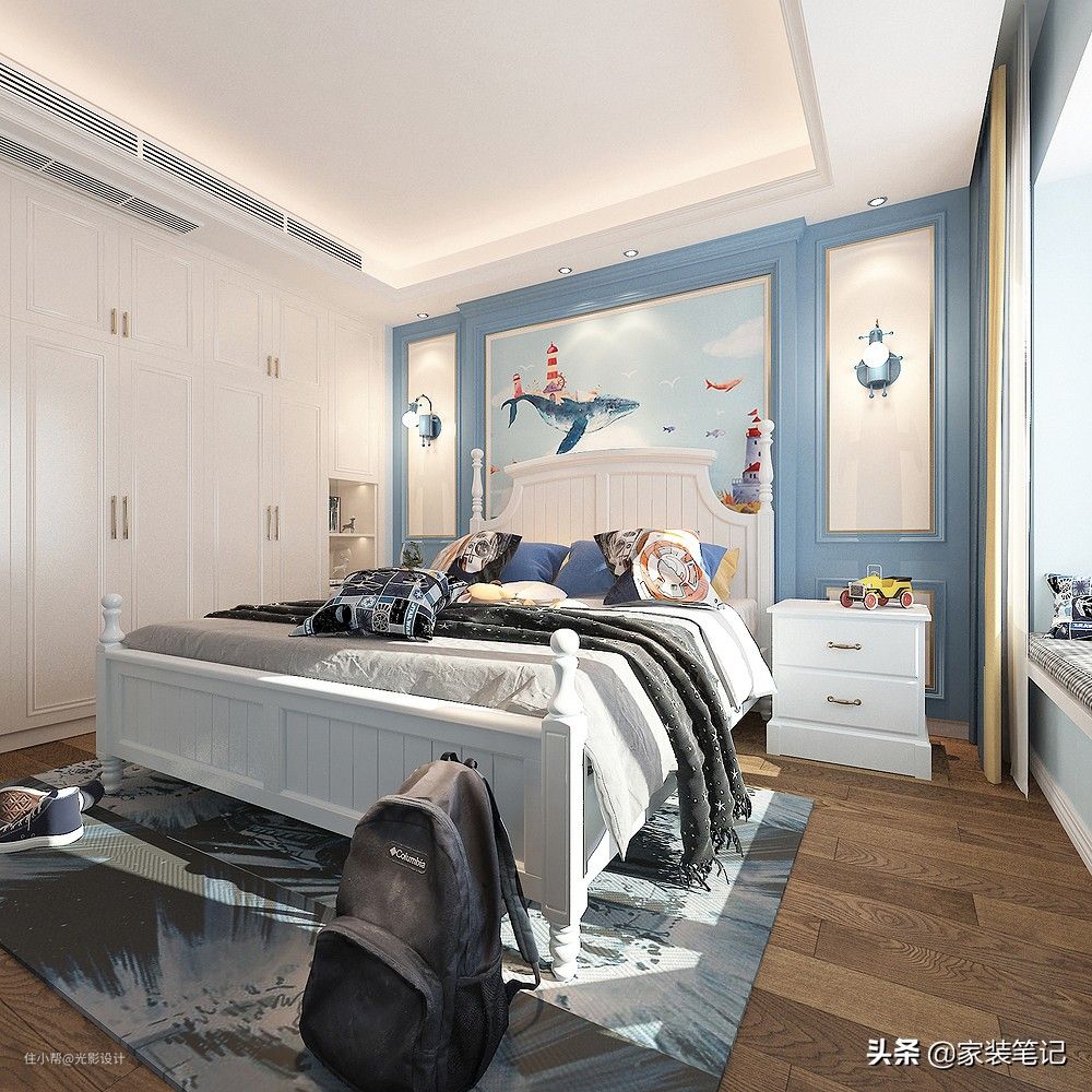 这个是业主小儿子在的房间,床头的动物图案,成了房间的主题,体现着孩子的童趣。床头背景凹凸有致,两边对称的壁灯也展现出了小孩房的童味。
