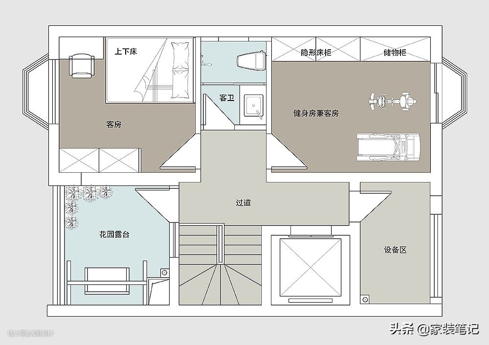 一层没有卧室,都是公共区域,从玄关进来一个过道空间,然后就是餐厅和客厅了,另外还有一个厨房,外面有一个后花园,是家里面闲情雅致之地;二楼两个带卫生间的小孩房套房,两个套房里面还有独立的阳台空间;三层一整楼都属于主卧室套间;四楼则是健身娱乐区,保留了一个客房,平时来客人了可以临时居住一下,设备间也在四楼。