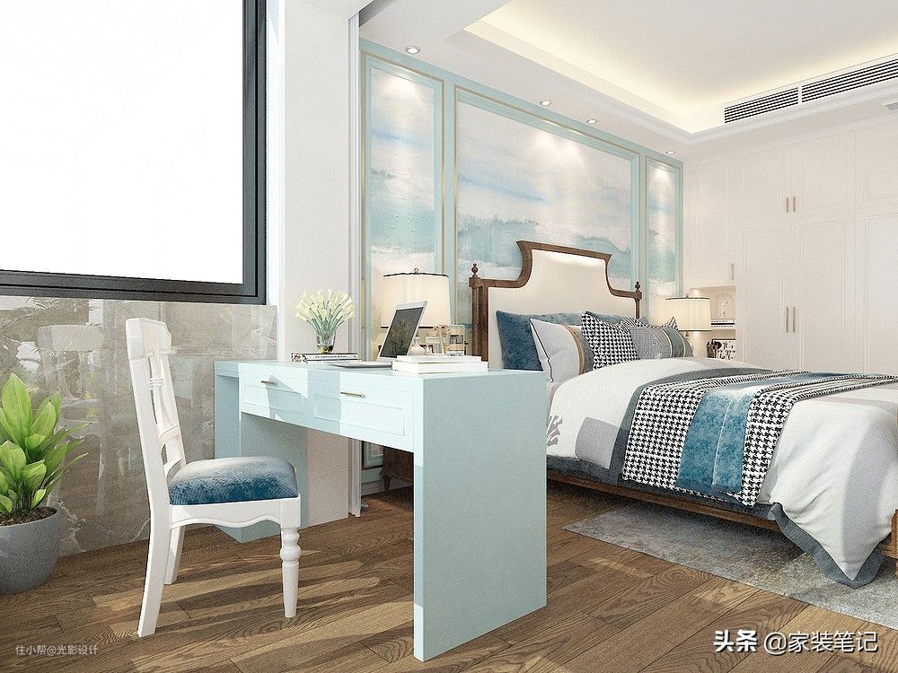 这个是业主大儿子的房间,大面积的白色加上绿色做点缀,尽显空间的活力,“绿气”逼人。主卧和阳台之间摆放一张桌子,让阳台区域成了孩子房的书房区域。