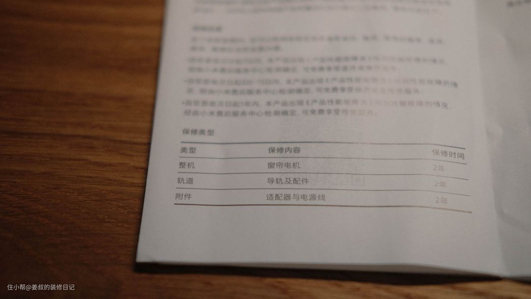 最后还要提下电动窗帘的保修,虽然这不是选购的关键要点,但是我还是要说下,在买电动窗帘时,我发现不少安装过的人会遇到电机或者轨道故障问题,而申请售后发现保修只有1年,结果只能自费维修,所以除了选购大品牌的电动窗帘外,还要注意窗帘的保修时间,像我用的米家智能窗帘提供电机、导轨及配件、适配器和电源线2年质保,这样大大降低了保修方面的风险。
