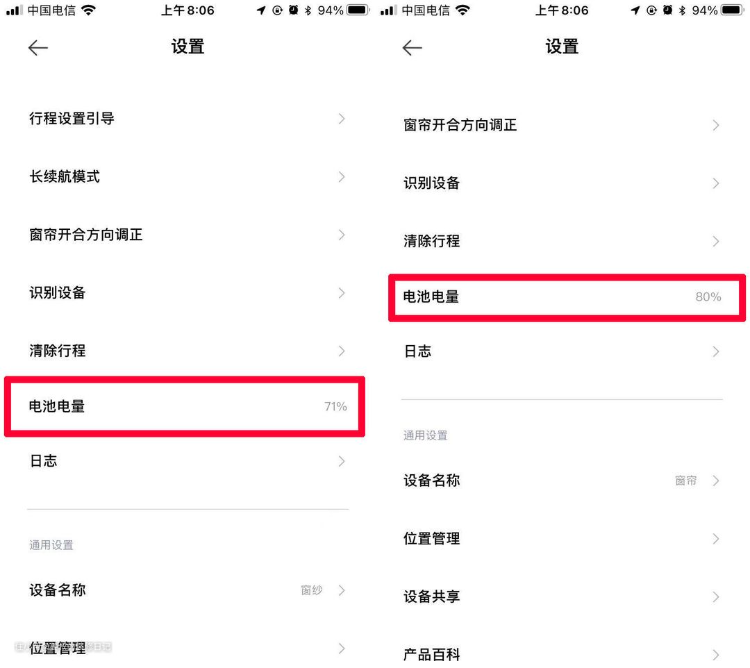锂电池版的电动窗帘到底耗电量如何,米家智能窗帘的电池容量达到6200maH,按照官方宣传,续航时间可达6个月,下图是我在安装并使用两周后的电量,电池并没有充电,直接用的,最初电量分别是72%、81%,半个月时间只下降了1%的电量,而且这期间,电动窗帘每天都会有使用(智能场景自动开闭),所以我对耗电量还是很满意的。