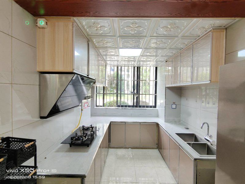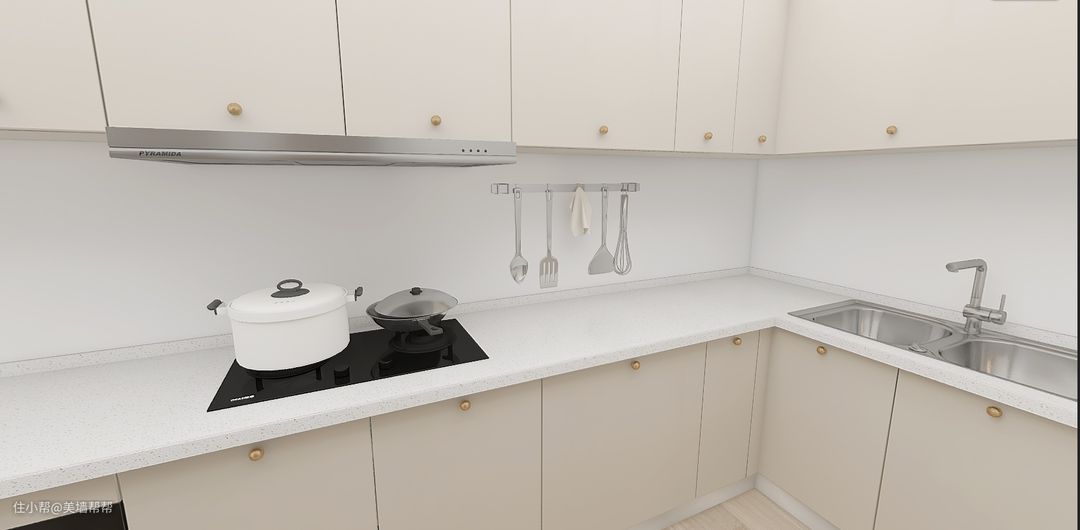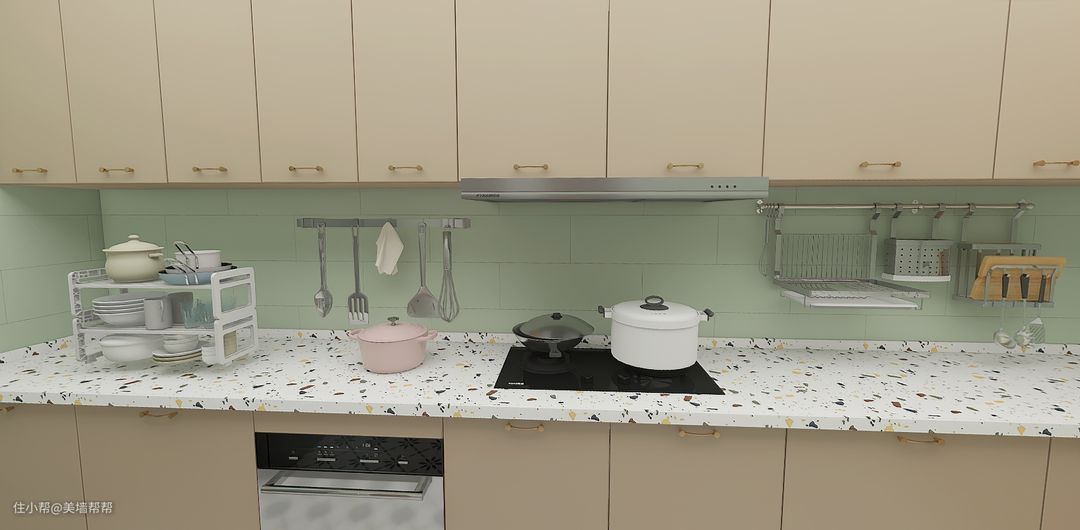 因为房东原本不想做内嵌式的灶台,为了以后方便搬运,所以将直接将灶台放在岩板上,增加了更多橱柜空间。