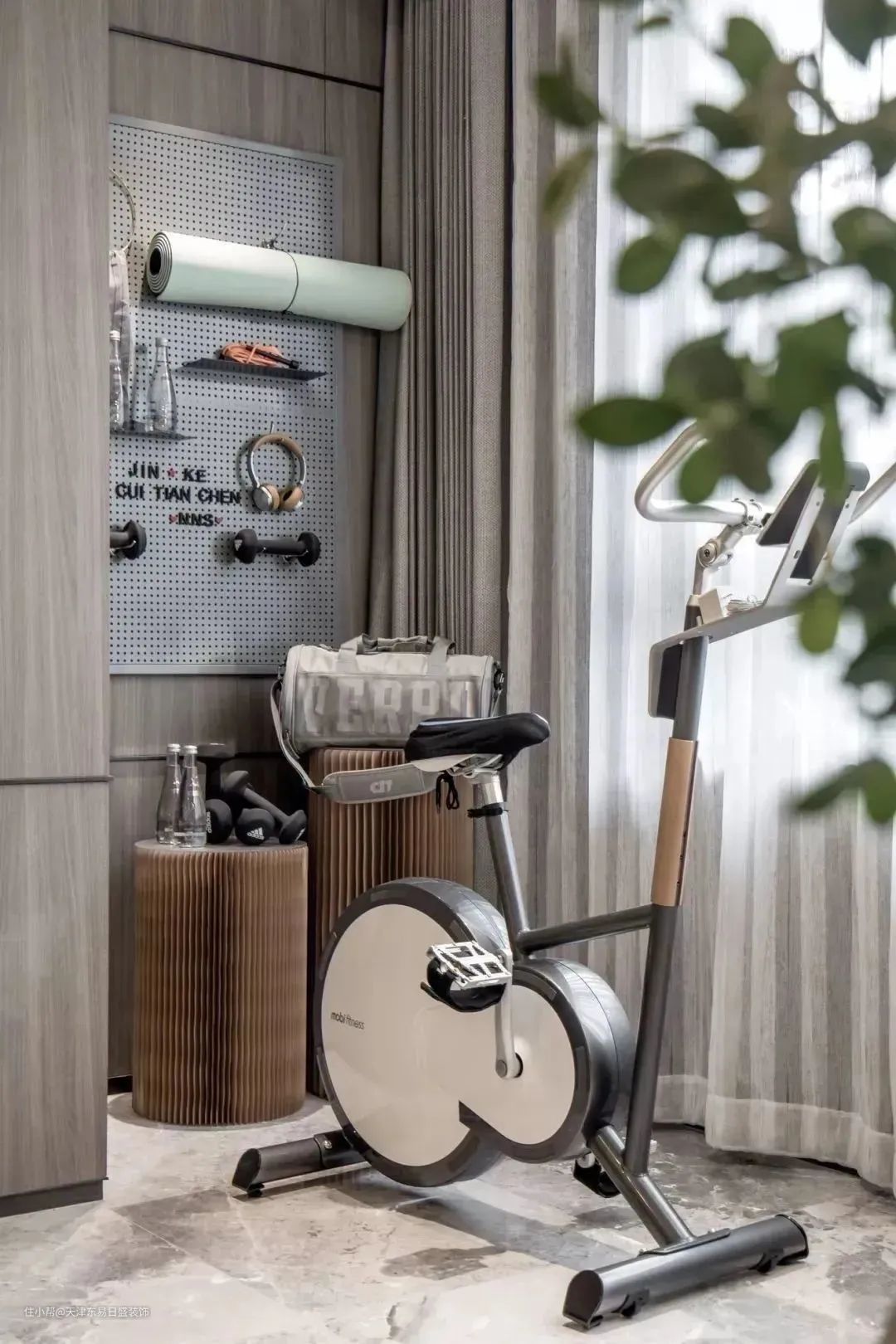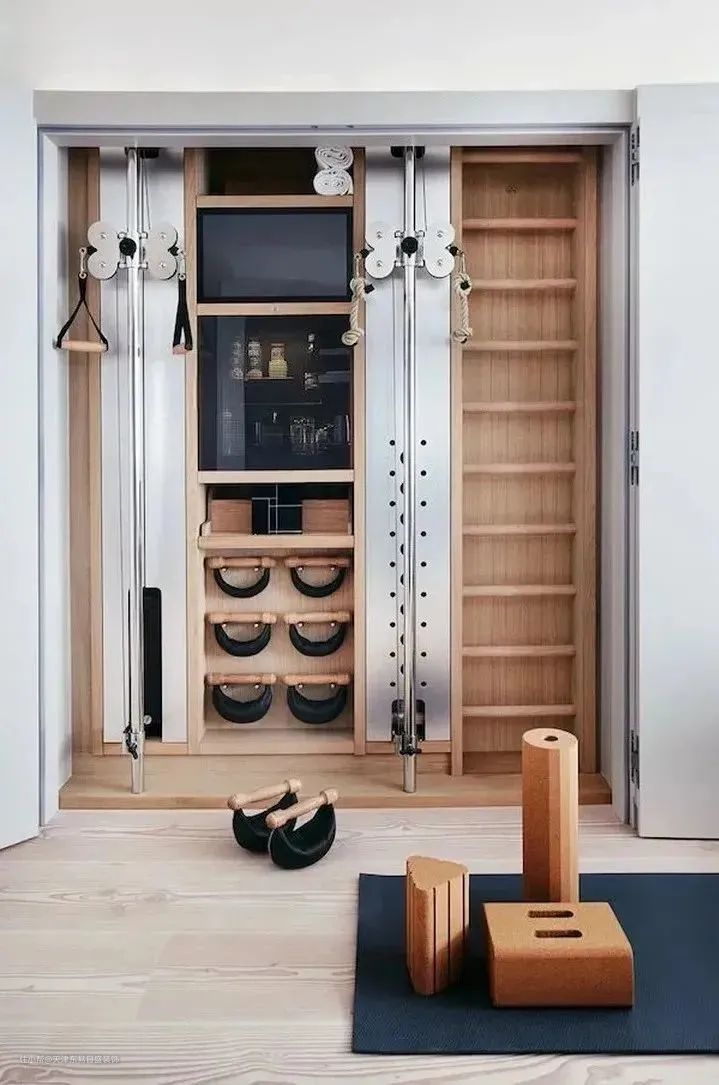 ▲若是健身达人,干脆把一面墙内嵌柜子,做器械收纳,方便整理。专业锻炼,在家也能实现。