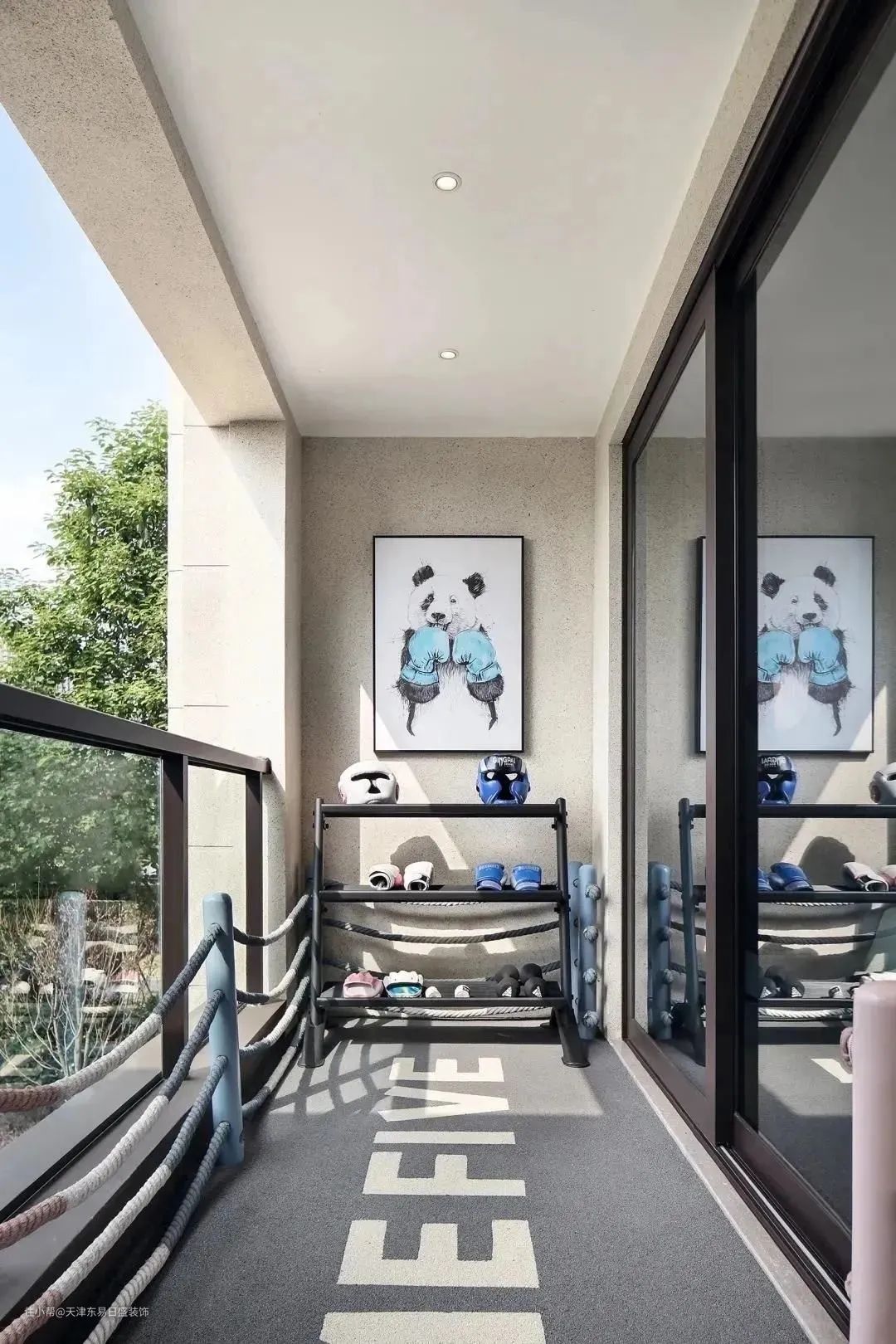 ▲铺上专用地毯,加上拳击围栏,阳台就是你的拳击场,一侧放架子做收纳,空余的另一侧还可以放一个小沙袋。