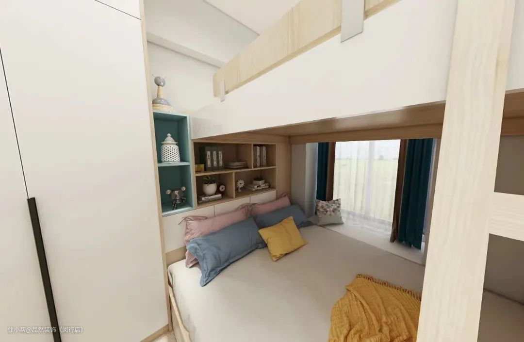而在做室内设计的时候,很多人也是觉得飘窗较为鸡肋。其实遇到有飘窗的小卧室,不妨换个思路,把飘窗与床拼起来设计,因为飘窗的高度与床的高度是差不多的,我们可以让飘窗与床连成一体定制,让飘窗也可以成为床铺功能的一部分,这样床小一点也可以借助飘窗空间来使用。