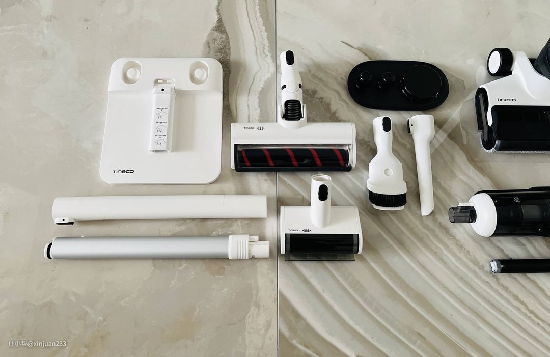 ▼左边就是它的吸尘器模块,包括电动软绒地刷、电动床褥吸头、扁嘴吸头、二合一吸头、延长杆、收纳支架等。整体来说已经是一款功能比较全面的吸尘器了,可以应付绝大部分使用场景。